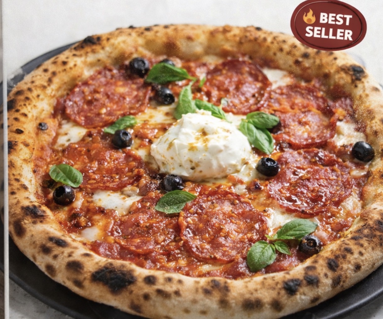 Spianata piccante italienne, mozzarella fondante, sauce tomate maison., olive et burrata